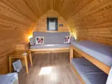 A surprisingly roomy interior sleeps two adults and 2 children (or small adults) with a double sofa bed and a small bunk bed. Equipped with heating, mini fridge, tv, DVD player, kettle, and table. Outside find a coals BBQ and picnic table to enjoy breakfast with those glorious sea views and the Fishguard Bay Resort first class showers and facilities are just a short stroll away.