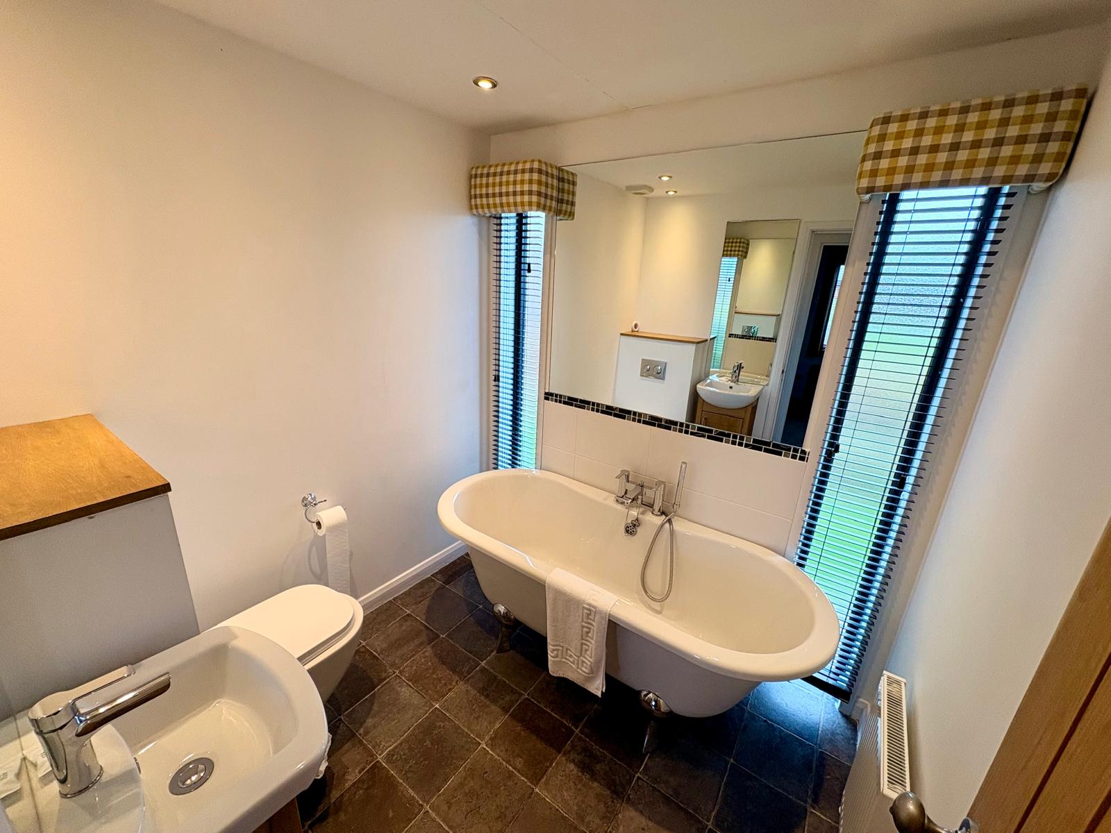- Contemporary family bathroom with free standing roll-top bath and separate shower
