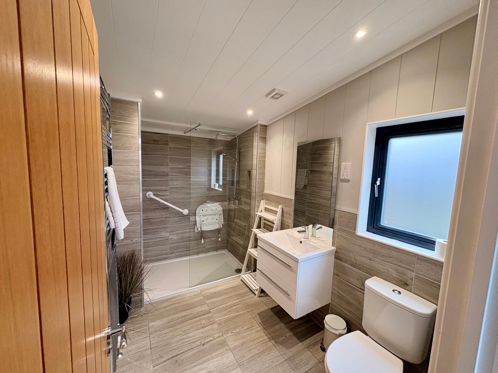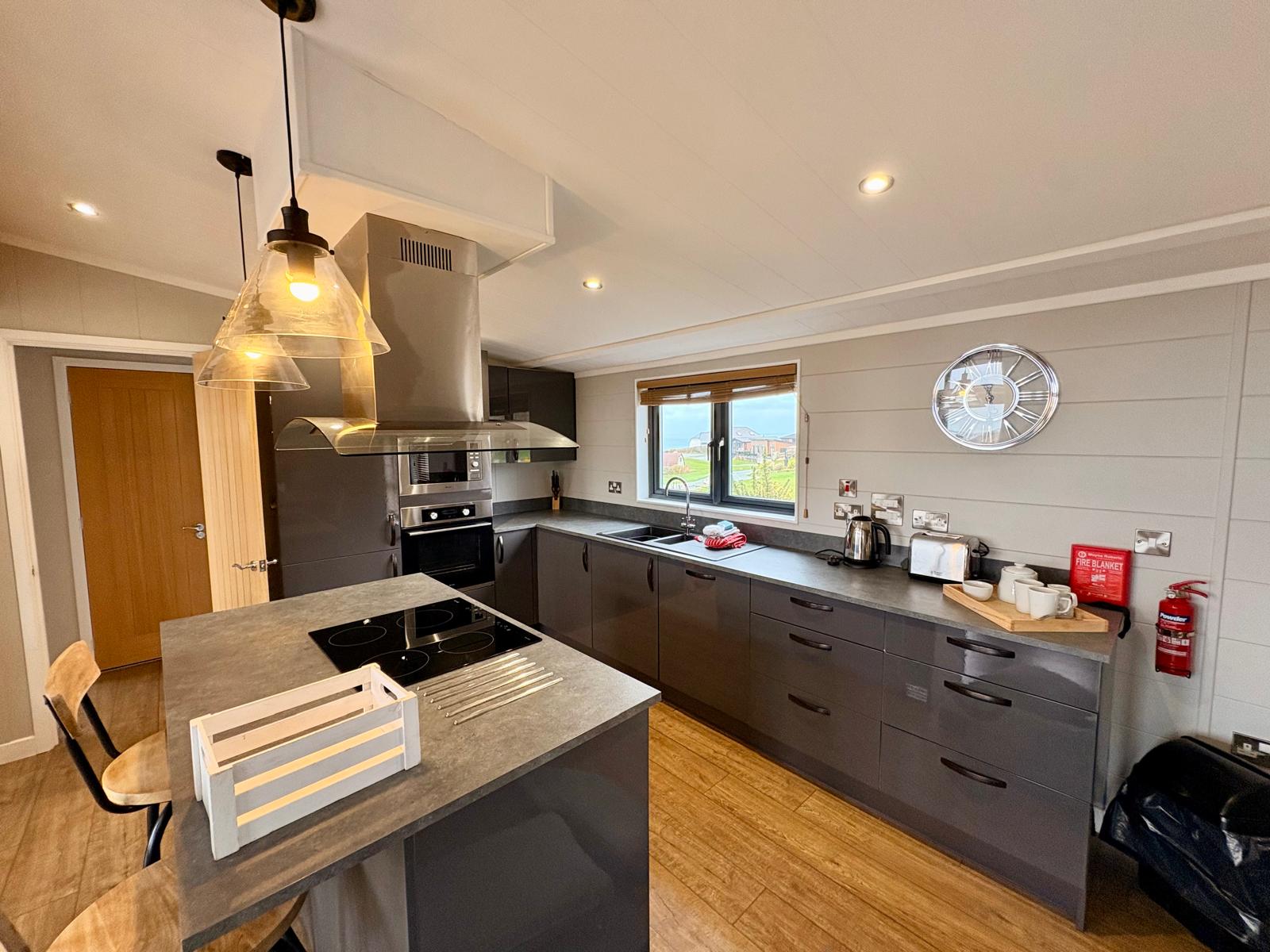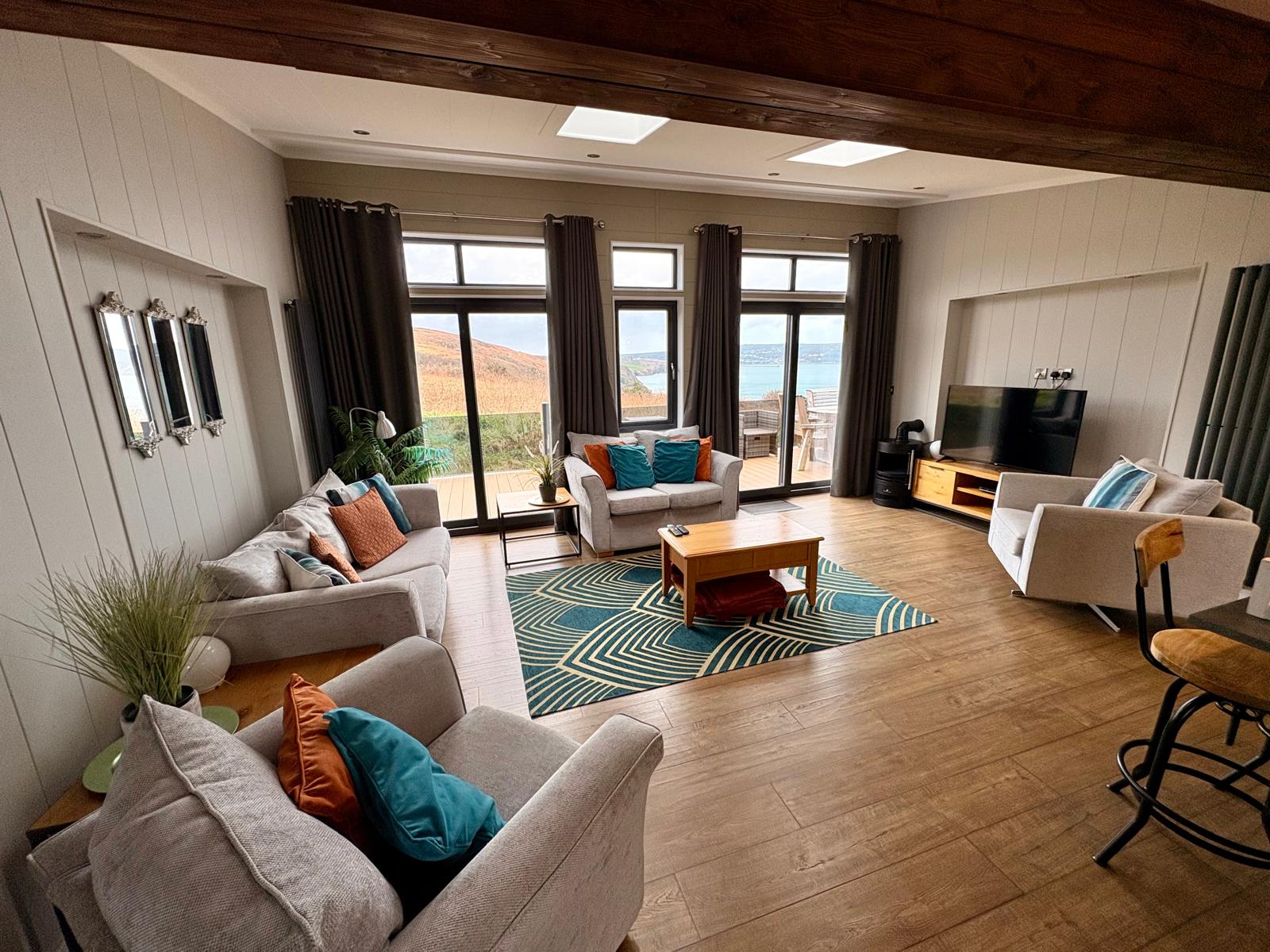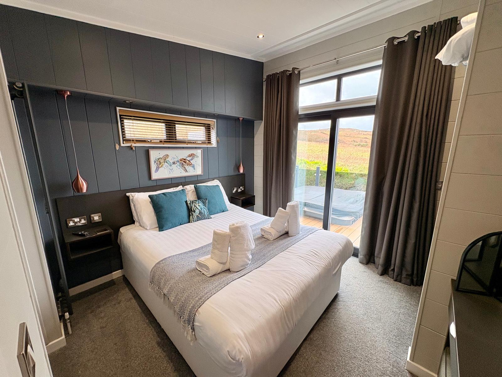 This Lodge has a centre lounge layout forms the hub of the home; ideal for entertaining and relaxing. It’s adjoined by two double bedrooms with sliding patio doors to the front elevation overlooking Fishguard Bay and ferry port and The Hot tub is square and sunken. The main bedroom has a super king size bed with spacy Ensuite and a walk-in shower. The second bedroom has two twin beds, with access to a jack and jill shower room . This large has an open plan layout with two sets of sliding patio doors to the front elevation allows you to make the most of stunning holiday views come rain or shine.